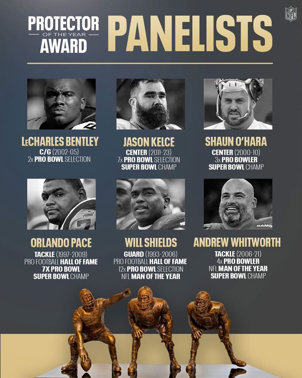 The award is chosen by a group of former All-Pro centers, guards and tackles, bringing championship experience and position-specific expertise to the evaluation. These NFL Legends understand the technical demands, preparation and physical toll of the position.